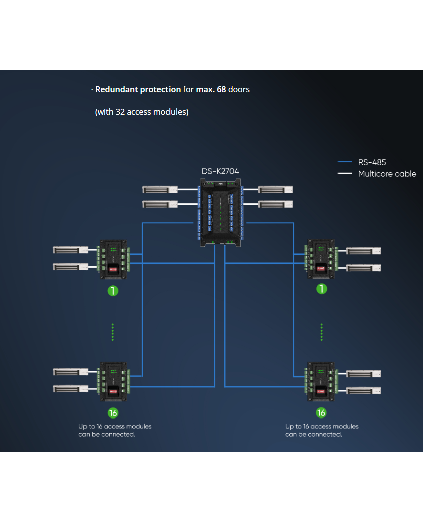 - Supports 1 door control. It can extend up to 62 DS-K2M002X access modules, and up to 125 doors can be controlled