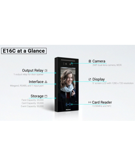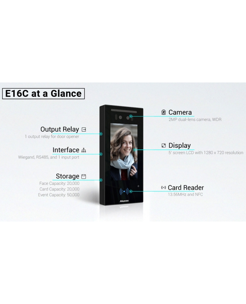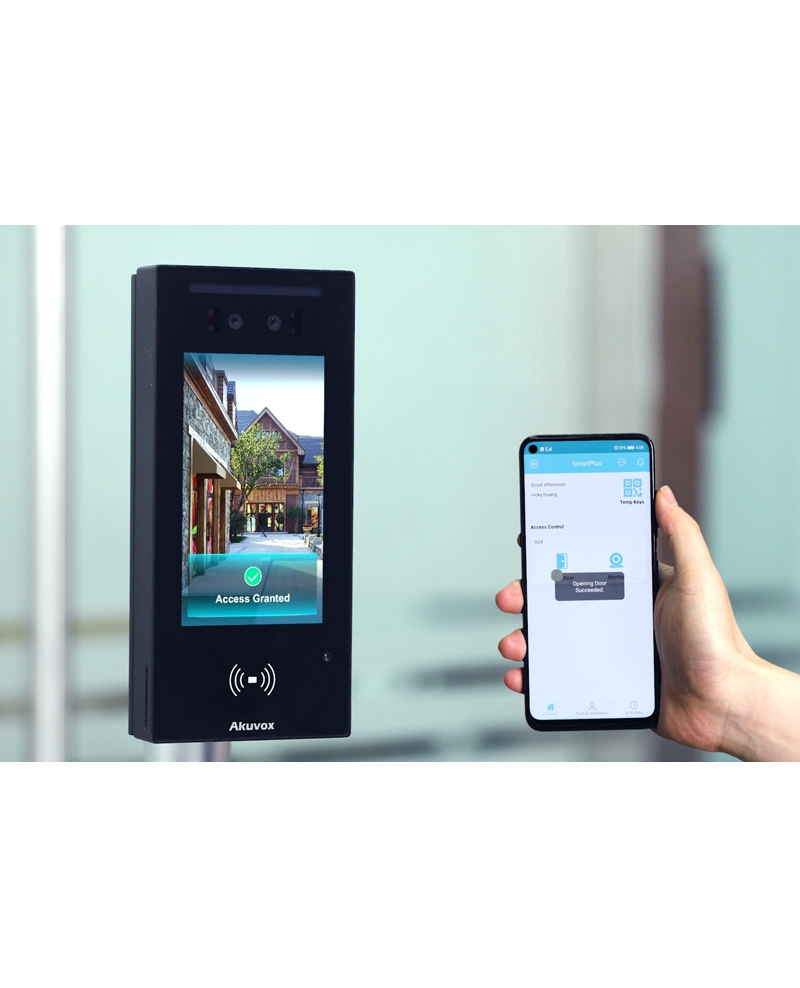 Using the latest deep-learning AI and dual-camera technology, the Akuvox E16C Access Unit allows secure, touch-free verification via face recognition (including mask detection), Bluetooth BLE, RFID and QR Code scanning, supported by the Akuvox SmartPlus smartphone app.