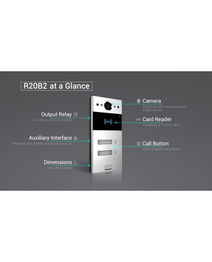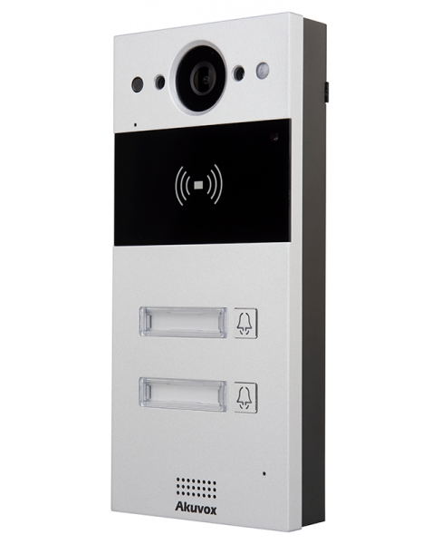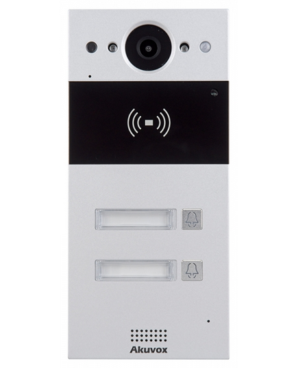 The Akuvox R20B2F is a highly-compact, IP-connected Door Intercom. It features 2 Call Buttons with Nameplates, high resolution colour camera, RFID card reader and NFC contactless via smart phone for secure remote audio/video communication and door entry.