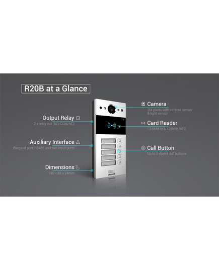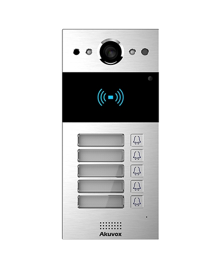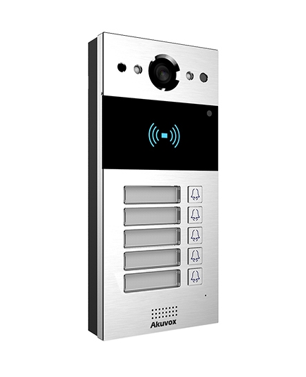 The Akuvox R20B5S is a highly-compact, IP-connected Door Intercom. It features 5 Call Buttons with Nameplates, high resolution colour camera, RFID card reader and NFC contactless via smart phone for secure remote audio/video communication and door entry.