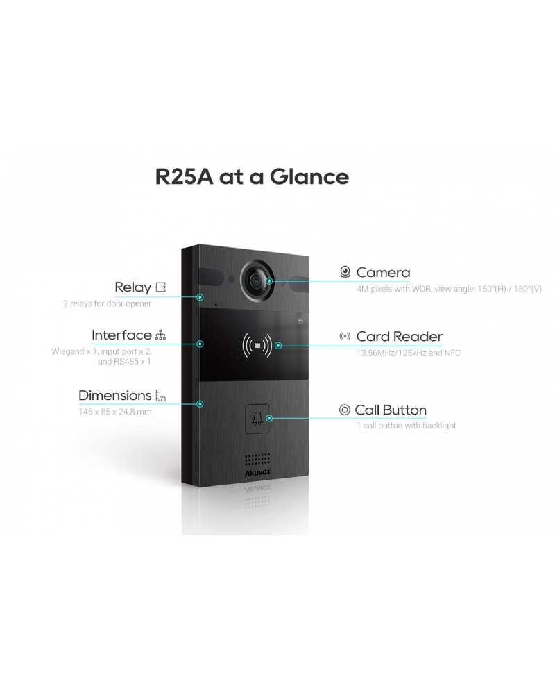 Using the latest IP connectivity technology, the new Akuvox R25A IP intercom enables visual monitoring and one-to-one voice communication between residents & visitors and secure remote access; idea for multi-dwelling (MDUs), apartments, entrance gates and unmanned office receptions.