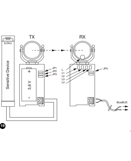 Blue-Bus connection photocells with a wireless transmitter to secure on a moveable leaf