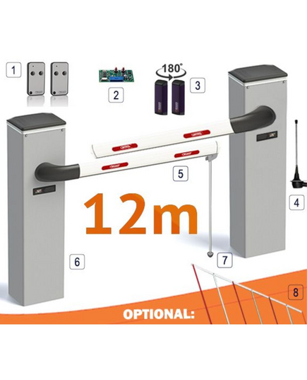 The barrier kit contains the barrier box/motor, spring, receiver, two remotes and a set of photocells, the boom/arm comes separately. As always an arsenal of accessories from lighting kits, skirts and supports.