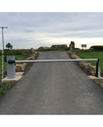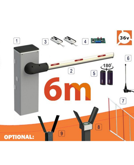 The barrier kit contains the barrier box/motor, spring, receiver, two remotes and a set of photocells, the boom/arm comes separate. As always an arsenal of accessories from lighting kits, skirts and supports.