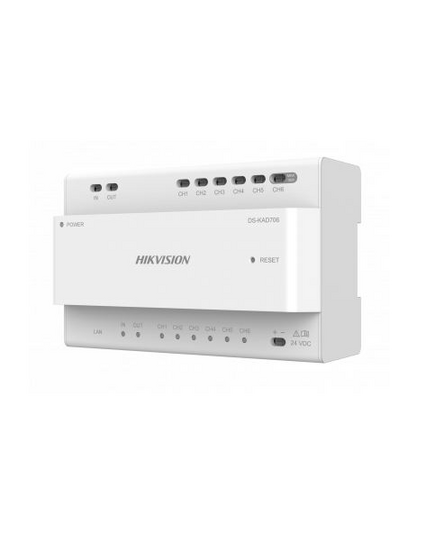 DS-KAD7060EY Hikvision 2 Wire Video/Audio Distributor is used to distribute power and data to Hikvision 2 wire (HD not 2 wire IP) intercom modules such as DS-KD7003EY-IME2 outdoor camera station and DS-KH7300EY-WTE2 indoor touch screen. The DS-KAD7060EY distributor will connect up to 6 devices or can be daisy-chained to additional DS-KAD706 or DS-KAD706-S distributors where more devices are required.