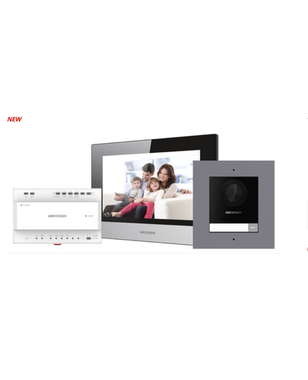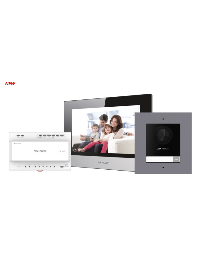 Hikvision's DS-KIS702Y-P 2-wire IP bundle includes a DS-KD8003Y-IME2 Door Station, a DS-KH6320Y-WTE2 Indoor Station, a DS-KAD704Y two-wire Distributor, and, a 16GB TF card.