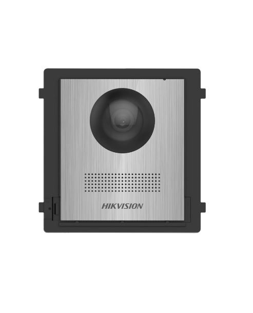 The Hikvision DS-KD8003-IME1(B)-NS is a 2MP fisheye video intercom module door station with wide dynamic range (WDR), IR supplement light and night visibility.