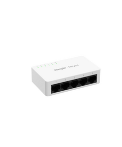 A compact 5-port 10/100/1000 Mbps unmanaged switch with high reliability, Ruijie Cloud visibility, and fanless operation, ideal for versatile network setups.