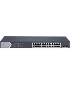 Hikvision Smart Managed 24-Port Gigabit PoE Switch, 24 × gigabit PoE ports, and 2 × gigabit fiber optical ports, IEEE 802.3at/af standard for PoE ports, Network topology management, alarm push, network health monitor, 6 KV surge protection for PoE ports, AF/AT camera can reach up to 300 m in extend mode, 3 year warranty.