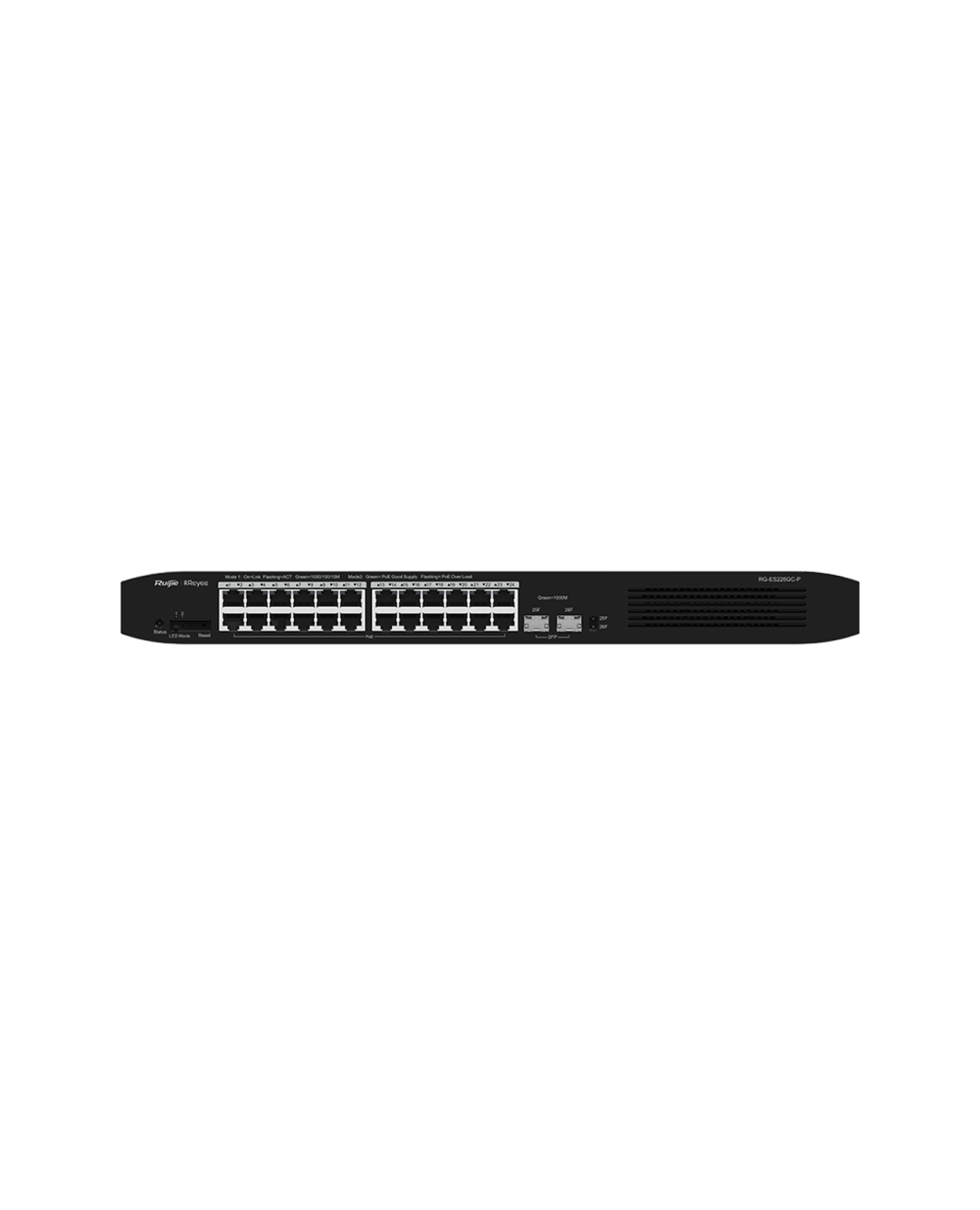 The Ruijie Reyee RG-ES226GC-P PoE switch has 24 PoE+ ports and has 2 SFP uplink ports.