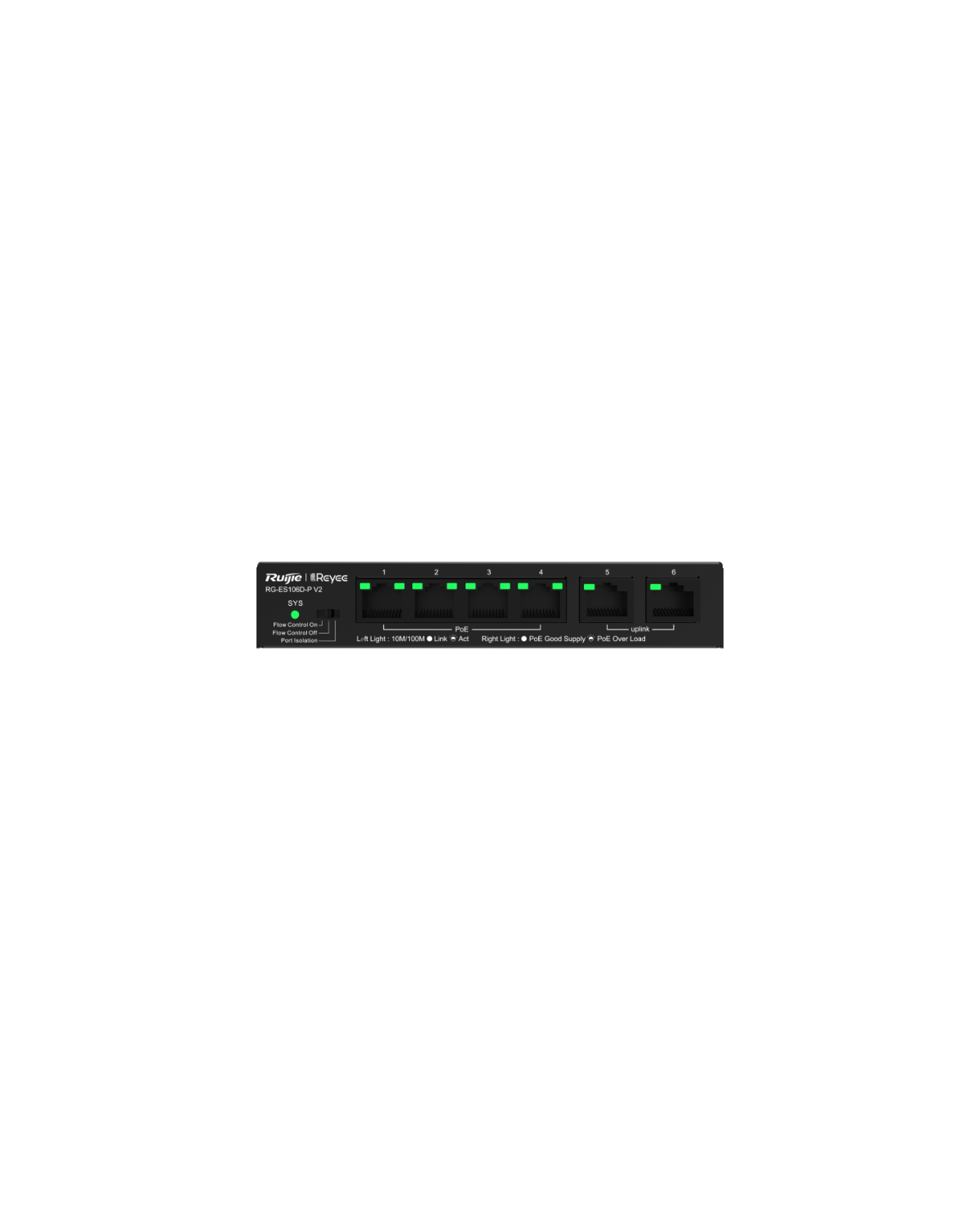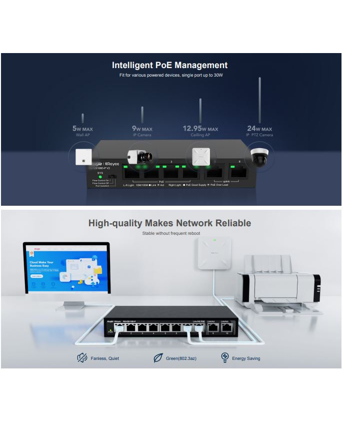 The Ruijie Reyee RG-ES106D-P V2 is a 6 port desktop unmanaged switch with 6 RJ45 ports (2 uplink + 4 downlink).