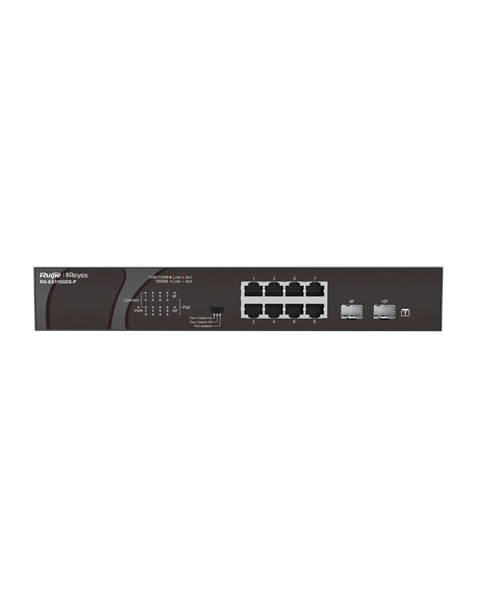 The Ruijie-Reyee RG-ES110GDS-P is an 8-Port Unmanaged PoE Switch that offers 8x 10/100/1000Mbps Downlink Ports with PoE/PoE+ power supply, 2x 1000BASE-X SFP Uplink Slots and 120W Max PoE power budget.