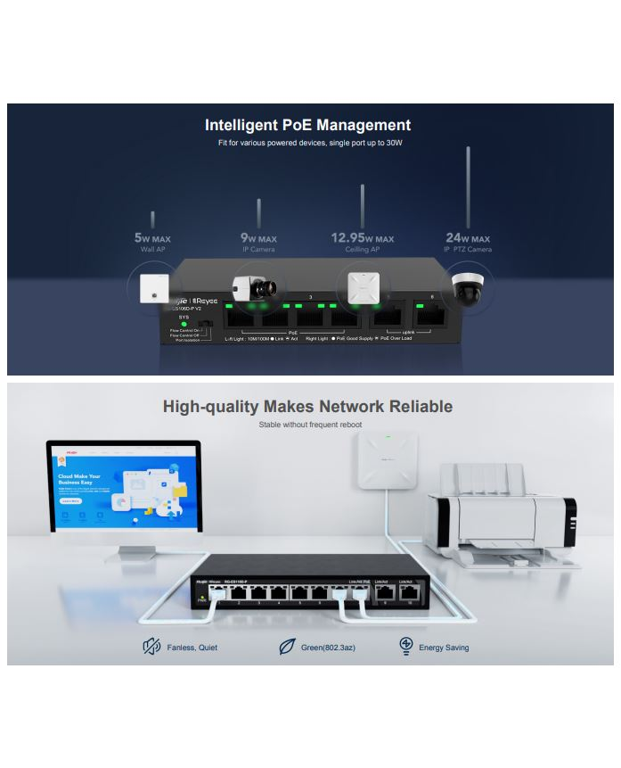 The RG-ES100 Series supports diversified product forms like desktop or rack-mounting installation and 6 to 26 port PoE/non-PoE switches helping customers cope with the stringent requirements of different projects.