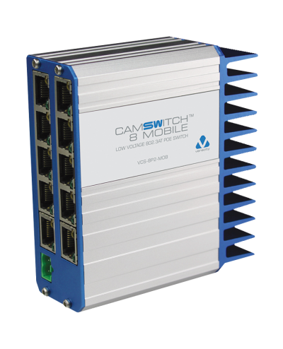 CAMSWITCH Mobile delivers up to 80 watts of IEEE802.3af / 802.3at compatible POE power to POE devices from a DC voltage as low as 8 volts, providing continuous operation during engine cranking or low battery scenarios. Ports may also be used for non-POE equipment such as mobile NVRs.