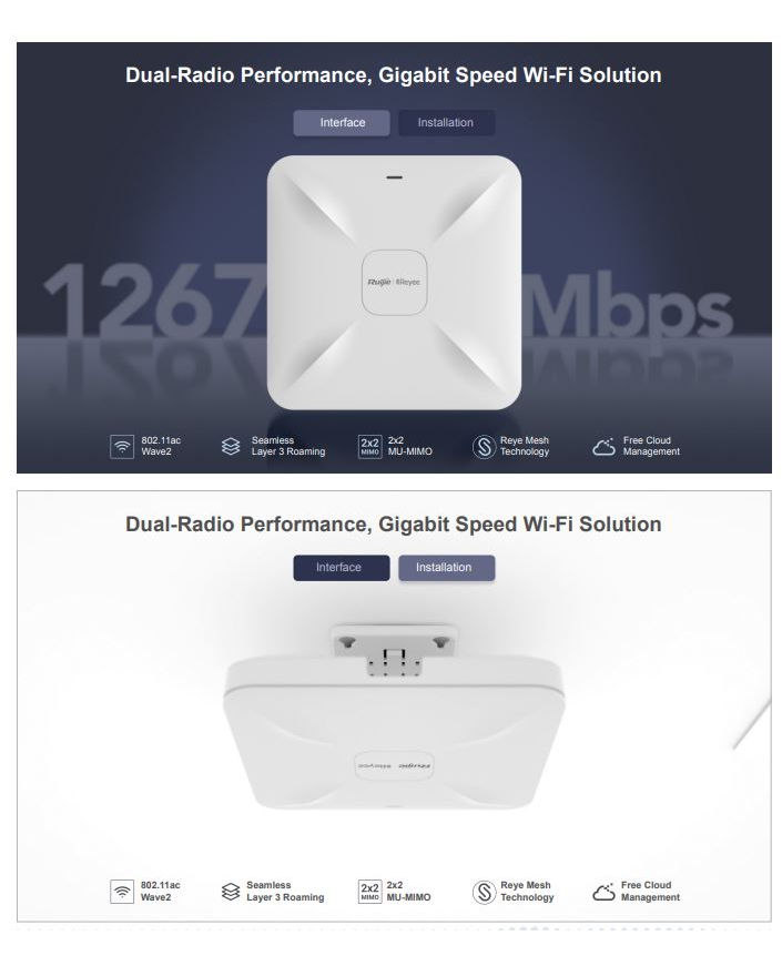 Compliant with 802.11a/b/g/n/ac Wave1/Wave2 Wi-Fi protocol, RG-RAP2200 supports MU-MIMO dual-stream technology and offers built-in omnidirectional antennas. It can operate concurrently at 2.4GHz and 5GHz, providing high-speed wireless access of 400Mbps at 2.4GHz, 867Mbps at 5GHz and up to 1267Mbps per AP.