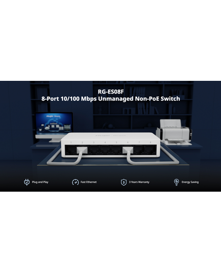 Highlight Features 5-port 10/100/1000 Mbps unmanaged non-PoE switch Unmanaged switch, which is visible on Ruijie Cloud High network reliability Applicable to various scenarios